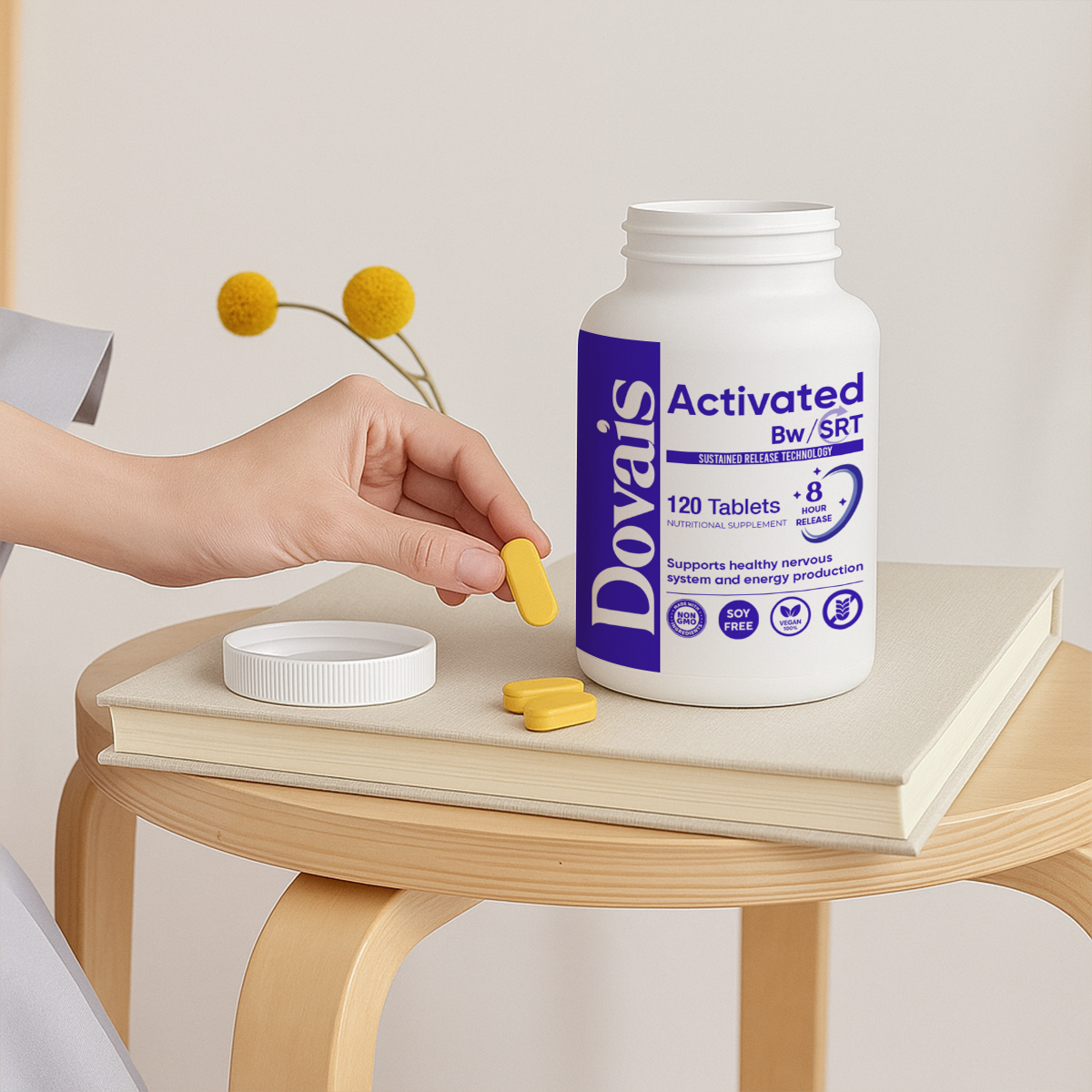 Dovais Activated B w/SRT® utilizes only the active B vitamin forms in a timed-release formula to fuel your body all day long. Your body uses B-vitamins in every cell in your body, every second of the day and night. Since they are water-soluble, your body cannot store B-vitamins and you must have a constant supply to keep your body systems functioning properly -- especially to maintain healthy energy levels.*
